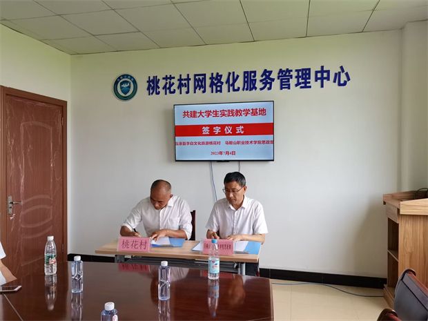 为深入贯彻习近平总书记关于“大思政课”的重要指示精神,推动党的二十大精神走深走实。7月4日,学院思政部与当涂县李白文化旅游区桃花村在桃花村签署共建大学生实践教学基地协议书,共同建设马鞍山职业技术学院思想政治理论课实践教学基地。马鞍山职业技术学院思政部和当涂县李白文化旅游区桃花村有关负责人等参加了此次签约仪式。