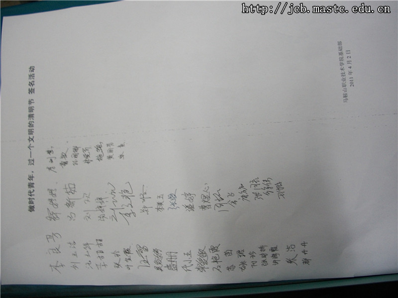 4月2日,在2011年清明节即将来临之际,思政部开展了清明节文明祭祀教育教学实践活动,教学实践活动有四个方面组成:1、向全院师生发倡议书,倡议做时代青年,过文明清明节。2、举行“做时代青年,过文明清明节签名活动”。3、各教学班级举行“怎样过一个文明的清明节”主题发言活动。4、“文明祭祀,平安出游” 主题征文活动。
