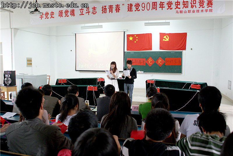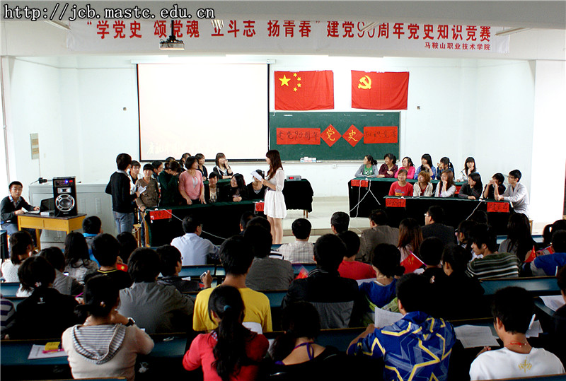 在这百花争艳,风景怡人的季节,我们踏着时代节拍,穿越岁月的时空,走向恢宏的九十年。马鞍山职业技术学院5月11日下午与南阶一举行了“迎接建党九十周年”党史知识竞赛决赛,以增加大学生的知识,展现大学生的青春风采,弘扬民族精神。回首在那灾难深重、血雨腥风的漫漫长夜,是“七一”的晨曦拨开华夏大地重重迷雾,激励着华夏儿女。流金的“七一”,燃情的“七一”,闪烁着真理的光芒的“七一,展现着我党坚定的信念与理想。