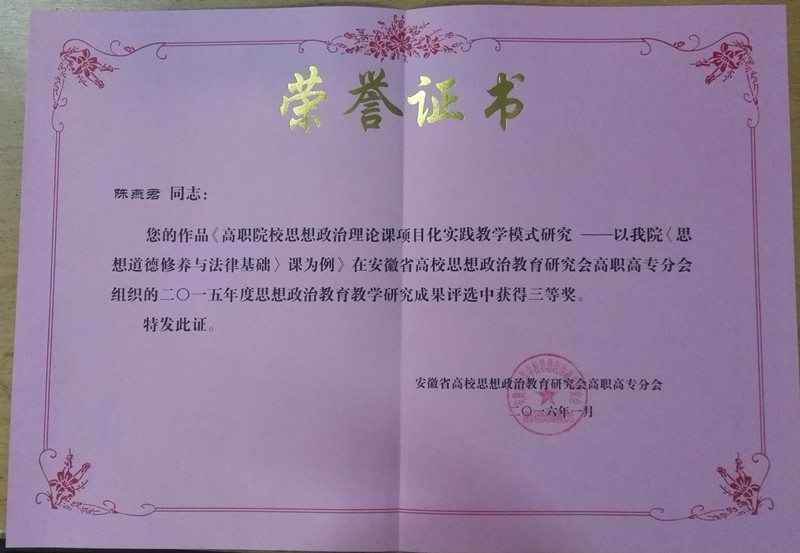 安徽省高校思想政治教育研究会高职高专分会2015年常务理事扩大会议于2016年1月15日在安徽工商职业学院召开,陈春林副书记代表学院参加会议。会议表彰了分会2015年度教育教学优秀成果和“翻转课堂”评选活动获奖个人。会前,我院思政部积极组织思政理论课教师参加各项评选,经过专家评审,我院孟昭苏老师获思政理论课“翻转课堂”教学评选一等奖;陈燕君老师获思政理论课教学研究成果评选三等奖。