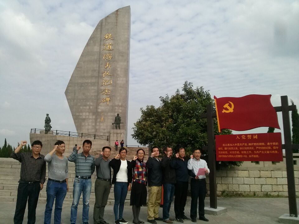 铁道游击队纪念园分为铁道游击队纪念馆和纪念碑两部分。纪念馆采取全景式壁画、大型雕塑、革命文物、图片资料、现代数码,声、光、电造型艺术相结合的表现手法,全面再现了当年的战斗和生活场景。在纪念馆,党员们跟随讲解员回顾了铁道游击队的光辉历史,聆听着战士们飞车截药、巧布截车的事迹,不禁被战士们英勇奋战、机智降敌所叹服。纪念碑雄伟壮观高耸入云,碑体由帆船、人物形状组成,其中有三尊铜铸铁道游击队队员,有的怀抱琵琶,有的持枪站立,分别位于船头帆下,意为铁道游击队胜利归来。在纪念碑前,全体党员在党支部书记王国春的带领下,郑重宣誓,重温入党誓词,使每一位党员再一次接受了心灵的洗礼,进一步坚定了理想信念和历史责任感。