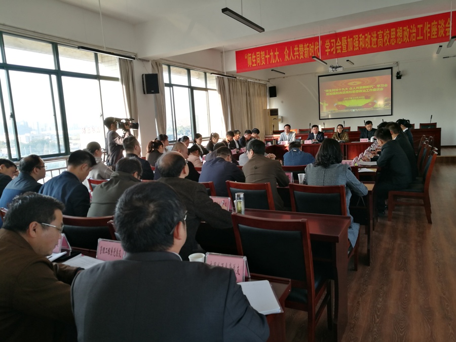 10月30日下午,学院召开“师生同贺十九大,众人共赞新时代”主题学习会暨加强和改进高校思想政治工作座谈会。党委书记邵许主持会议并发表重要讲话,副院长刘淑凤、党委委员刘恒出席会议,思政部全体教师,各系党支部书记,各直属支部书记和学生代表参加会议。