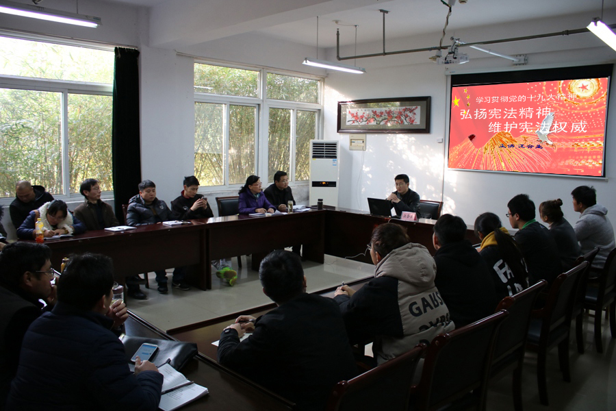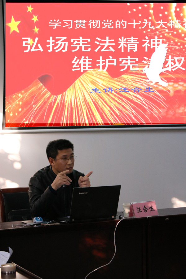 汪合生老师以《弘扬宪法精神,维护宪法权威》为题,对党的十九大关于深化全面依法治国实践进行了细致的解读,从全面依法治国是国家治理的一场深刻革命,从必须坚持厉行法治,推进科学立法、严格执法、公正司法、全民守法等方面进行了详细阐述,指出党的十九大进一步明确了加强宪法实施和监督,推进合宪性审查工作,维护宪法权威;深化司法体制综合配套改革,全面落实司法责任制,努力让人民群众在每一个司法案件中感受到公平正义;建设社会主义法治文化,树立宪法法律至上、法律面前人人平等的法治理念,充分体现了我们党坚定的道路自信、理论自信、制度自信、文化自信。汪合生老师还围绕“国家宪法日”制度,运用精准的数据、鲜活的案例,分析了我国现行宪法对“人权”的尊重和保障,厘清与宪法有关的重大理论和现实问题,对于我院教职工、学生准确把握十九大精神提供了重要的指导和帮助,师生得到了很好的法治教育。