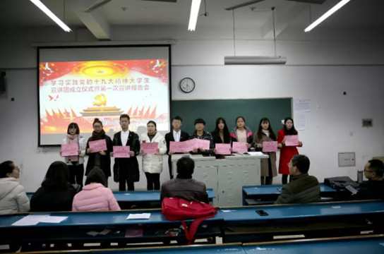 成立仪式上,王国春主任向与会的宣讲团成员颁发了大学生宣讲团聘书。王国春主任介绍了思政部决定组建学习贯彻党的十九大精神大学生宣讲团筹备情况,成立学习贯彻党的十九大精神大学生宣讲团是贯彻中共安徽省委教育工委和学院党委文件的要求,宣讲团成员来自学院学生骨干,经过思政部选拔和培训,院学习部和各系学习部各成立一个宣讲小组,深入到广大学生中开展微宣讲,充分发挥高校的理论优势和人才优势,把学习和宣传十九大精神推向深入,全面准确宣讲党的十九大精神。